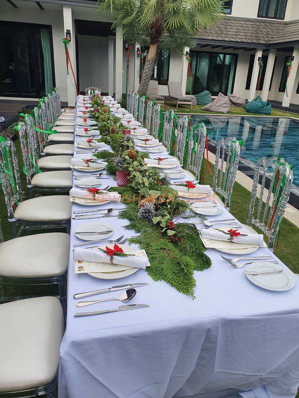 ชุดโต๊ะเหลี่ยมเก้าอี้คริสตัล เช่าเก้าอี้ชิวารี เช่าพัดลม เช่าแอร์เคลื่อนที่ บริการให้เช่า ลูกค้าเช่าชุดโต๊ะเหลี่ยมคลุมผ้าขาพร้อมเก้าอี้คริสตัล ลูกค้าจัดงานริมสระว่ายน้ำ ที่พัทยา เป็นงานจัดเลี้ยงเก๋ๆ ดูดีมีสไตล์