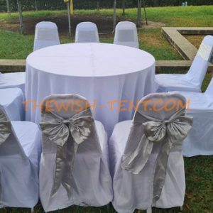 เช่าโต๊ะ-โต๊ะจีน1.5ม.เก้าอี้บุนวมคลุมผ้าขาวโบว์สีเงิน