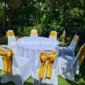 เช่าโต๊ะ-โต๊ะจีน1.2ม.เก้าอี้บุนวมคลุมผ้าสีขาวโบว์สีทอง