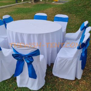 เช่าโต๊ะ-โต๊ะจีน1.5ม.+เก้าอี้พลาสติกคลุมผ้าสีขาว+โบว์สีน้ำเงิน