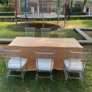 เช่าชุดโต๊ะเหลี่ยมผ้าคลุมสีทอง-เก้าอี้ชิวารี_คริสตัลเจ้าหญิง