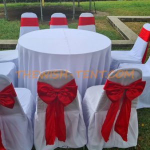 เช่าโต๊ะ-โต๊ะจีน1.5ม.เก้าอี้บุนวมคลุมผ้าขาวโบว์สีแดง