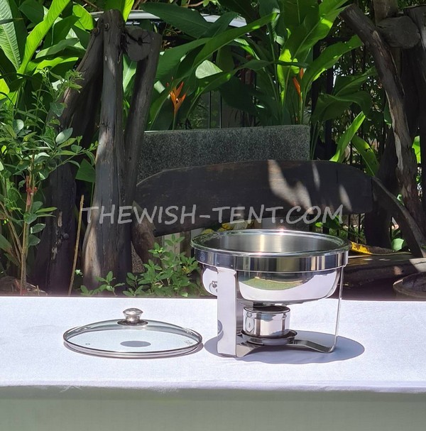 ให้บริการเช่าอ่างอุ่นอาหารแบบกลม เหมาะสำหรับอาหารที่เป็นซุปหรือแกง มีความลึก มีฐานขาตั้ง พร้อมที่ใส่แอลกอฮอล์ ค่าเช่า 190 บาท/ชุด