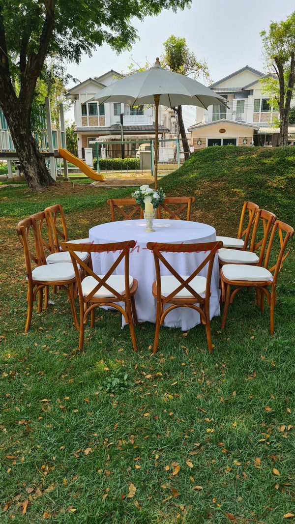 เช่าโต๊ะกลม เช่าเก้าอี้ชิวารีครอสแบ็ค เช่าเก้าอี้ไม้ครอสแบ็ค เช่าโต๊ะจีน ให้เช่าโต๊ะจีน เช่าชุดโต๊ะกลม โต๊ะกลาง ขนาด 1.50 ม. คลุมผ้าขาวถึงพื้นพร้อมเก้าอี้ชิวารีครอสแบ็ค_เก้าอี้ไม้ครอสแบ็ค+เบาะสีขาว 10 ตัว ราคาชุดละ 2,000 บาท เช่าเก้าอี้งานแต่งงาน เช่าเก้าอี้งานหมั้น รับจัดงาน เช่าเต็นท์