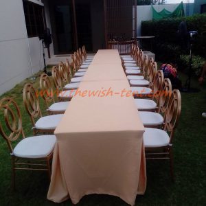 สามารถติดต่อสั่งจอง เช่าชุดโต๊ะเหลี่ยม เก้าอี้ชิวารี RoseGold เช่าโต๊ะเหลี่ยม : โต๊ะเหลี่ยม ขนาด 1.80 ม. คลุมผ้าสีทองถึงพื้นพร้อมเก้าอี้ชิวารี RoseGold+เบาะหนังสีขาว 6 ตัว ราคาชุดละ 980 บาท