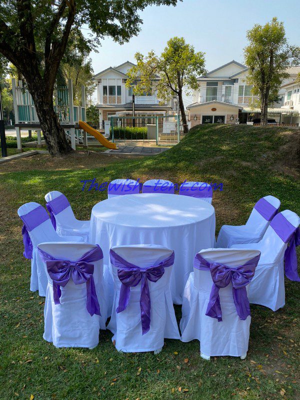 เช่าชุดโต๊ะจีน-1.5ม.+เก้าอี้บุนวมคลุมผ้าสีขาว+โบว์สีม่วง ประกอบด้วย โต๊ะกลมกลาง ขนาด 1.50 ม. คลุมผ้าขาว พร้อมเก้าอี้บุนวมคลุมผ้าสีขาว 10 ตัว + โบว์สีม่วง ราคาชุดละ 750 บาท เช่าเก้าอี้ใช้งานแต่งงาน เช่าเก้าอี้งานหมั้น รับจัดงาน เช่าเต็นท์