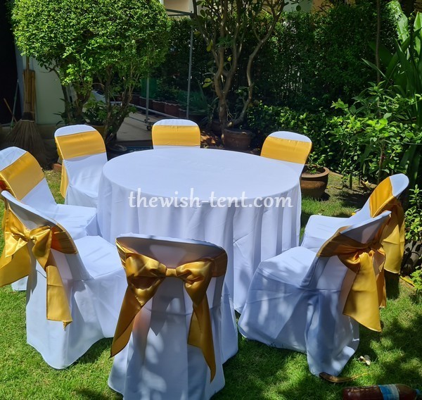 เช่าโต๊ะจีนคลุมผ้าขาว ขนาด 1.20 เมตร จำนวน 1 ตัว มีสีฟ้าและสีขาวให้เลือก พร้อมเก้าอี้พลาสติกคลุมผ้าขาวและผูกโบว์สีทอง จำนวน 8 ตัว
