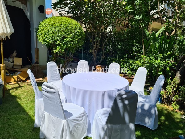 โต๊ะจีน+เก้าอี้บุนวมคลุมผ้าบริการให้เช่าโต๊ะหมู่บูชา โต๊ะจีน+เก้าอี้บุนวมคลุมผ้า ประกอบด้วย -โต๊ะกลางคลุมผ้าสีขาวขนาดเส้นผ่าศูนย์กลาง 1.20 ม.พร้อมเก้าอี้บุนวม 8 ตัว คลุมผ้าสีขาว ราคาชุดละ 600 บาทต่อวัน และให้บริการให้เช่าชุดรดน้ำสังข์ พัดลมไอเย็น พัดลมไอน้ำ เต็นท์ โต๊ะจีน โต๊ะเหลี่ยมหน้าขาว เก้าอี้ เก้าอี้ชิวารี เก้าอี้คริสตัล โซฟาสีขาว ร่มเชียงใหม่ ร่มสนาม และอุปกรณ์จัดงานอื่น ๆ