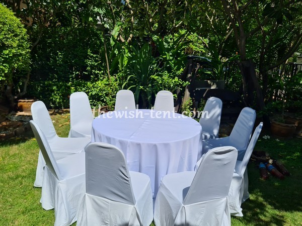 เช่าโต๊ะจีน 1.5ม. พร้อมเก้าอี้บุนวมคลุมผ้า เช่าโต๊ะจีน พร้อมเก้าอี้บุนวมคลุมผ้า ประกอบด้วย -โต๊ะกลางคลุมผ้าสีขาวขนาดเส้นผ่าศูนย์กลาง 1.50 ม.พร้อมเก้าอี้บุนวม 10 ตัว คลุมผ้าสีขาว ราคาชุดละ 650 บาทต่อวัน